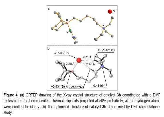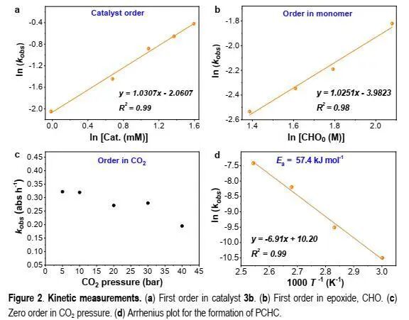 二氧化碳排放和非降解性塑料污染一直都是可持续社会所面临的两大挑战,利用二氧化碳制备可降解性聚碳酸酯,不失为良策。1969年,井上教授利用二乙基锌/水的混合物实现了二氧化碳和环氧烷烃的偶联反应,自此,该领域得到了科研工作者的诸多关注,并且开发出众多金属基催化剂用于该反应。但使用金属催化剂所得到的聚合物一般会有金属残留,且有颜色。金属毒性以及颜色附着使得聚合物的应用受限。出于节约成本、避免化学浪费以及金属毒性的考虑,有机催化剂在聚合化学中展现出强大的优势。先前,已有三乙基硼/鎓盐体系用于该环氧烷烃和二氧化碳共聚,打破了金属催化剂用于该反应的专利,但是催化剂的性能仍低于许多先进的金属催化剂。本文展示了一系列高活性的双功能有机催化剂用于环氧烷烃和二氧化碳的交替共聚(图1)。 图1 催化剂可以通过简单的两步反应合成,如图1b,原料廉价且商业化,反应产率高,因而可以在实验室实现公斤级生产。作者综合研究了催化剂结构、催化剂负载量、反应温度、反应时间以及CO2压力对CO2/CHO耦合的影响。纵观整体,聚合物选择性>99%,聚碳酸酯结构单元>99%,分子量分布<1.25,GPC呈现双峰,反应符合不朽聚合特征。催化剂中B原子和N+之间的亚甲基链的长度、N+上的取代基以及反离子都对聚合活性有影响。经考察,亚甲基个数为5且反离子为溴,即催化剂3b,是最优催化剂。催化剂适用温度跨度大(25-150 ℃),温度升高会提升催化活性,且在150 ℃仍旧保持>99%的聚合物选择性。鉴于CO2的插入不是决速步,CO2压力对聚合活性影响很小。催化剂可实现高负载高活性催化,将催化剂的负载降低到0.005 mol %,反应48h,TON值可达13000,催化效率为5.0 kg PCHC/g 3b,对于CHO和CO2的偶联反应,任何先前报道的均相金属或有机催化剂都没有达到5.0 kg PCHC/g催化剂的效率。 图2 动力学研究表明,ln(kobs)随ln([3b])呈线性增长,斜率为1.03,表明催化剂3b符合一级动力学行为(图2a),该催化共聚过程以协同催化为主;ln(kobs)与ln([CHO0])呈线性相关,斜率为1.02,表明共聚反应对CHO是一级反应(图2b);CO2符合零级动力学行为(图2c),证实耦合过程中CO2插入非决速步。通过对不同温度(60 ℃、80 ℃、100 ℃、120 ℃)的CHO/CO2共聚的低转化率实验,得到了PCHC形成的表观活化能为57.4 kJ/mol(图2d),与先前报道一致。 图3 通过对比实验,发现双组分催化效果远不如双功能的3b催化剂(图3),3b中季铵盐和B原子的分子内协同催化效应是催化剂具有高活性的关键。通过核磁共振谱图,观察到3b与8以及8/BTEAB这两者的峰,有明显的差异,它是一个宽的共振(FWHM = 1371 Hz)且化学位移略微向高场偏移(Δδ = -0.34 ppm),这一现象表明在分子内季铵盐和硼中心之间存在相互作用(图3c)。为了进一步直接证明催化剂的协同催化作用,作者试图在非配位溶剂中培养3b的单晶,但是失败了,作者认为这可能是由于季铵盐与硼中心之间存在动态相互作用所致。转而在配位溶剂中培养出3b单晶(图4),从晶体结构上可以推断,在非配位溶剂中,缺电子的B和正电的N+应该与Br -相互作用,并结合DFT论证。 图4 在控制实验结果、晶体结构和11B NMR分析的基础上,提出了分子内B/N+相互作用机理,如图5所示。为了更好地了解反应途径的机理,还进行了DFT计算,计算估计的整个过程的活化能为26.66 kcal/mol,与实验值相近,表明计算研究对图5中提出的机理有了更深的理解。 图5 综上所述,本研究通过一种极其简单和有效的方法制备了一系列具有高活性的由亲电性硼中心和亲核性季铵盐组成的用于CHO/CO2聚合的无金属催化剂。该催化剂的无金属特性、可伸缩的制备工艺、优异的催化性能以及长期的热稳定性,表明该催化剂有望成为大规模生产CO2基聚合物的候选催化剂。 原创 王同学 任伟民课题组 文章及图片来源: https://pubs.acs.org/doi/10.1021/jacs.0c03651 DOI:10.1021/jacs.0c03651