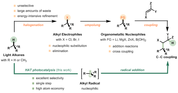 气态烷烃键的光催化断裂产生亲核烷基,可避免使用卤代烷烃或有机金属试剂